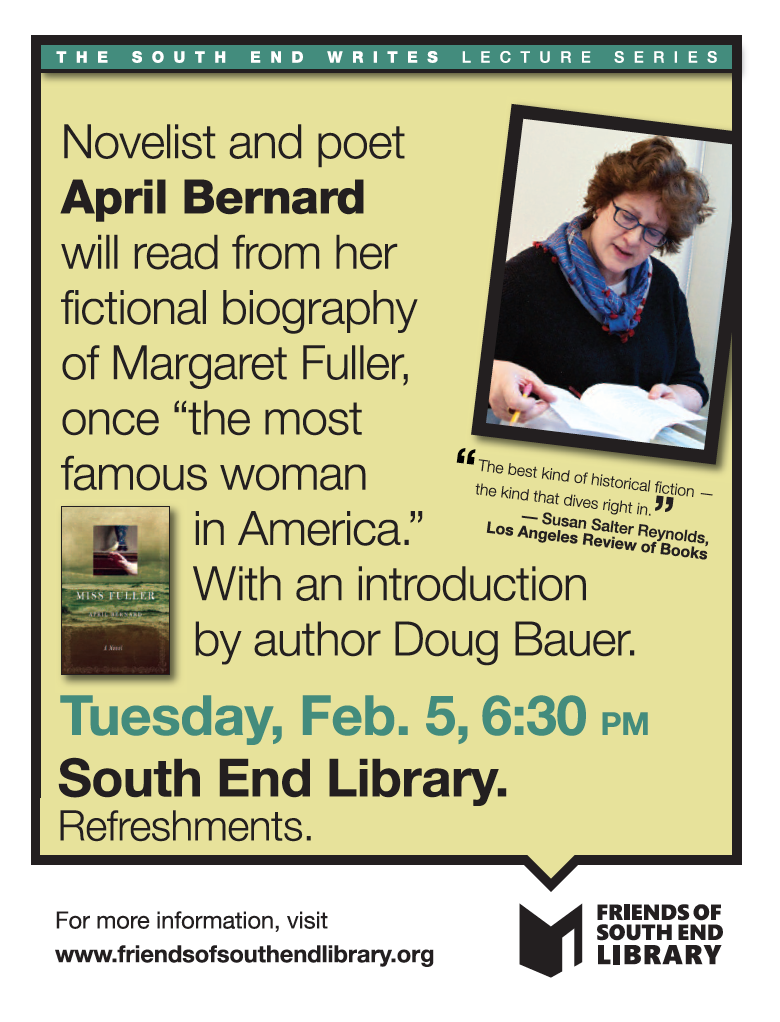 While "Miss Fuller" is fictionalized history, it is based on years of research and "coincides with facts as known," said Bernard, who teaches creative writing at Skidmore College. The story of how Henry Thoreau traveled to the shores of Long Island hoping to find a manuscript that might have survived the shipwreck in which Fuller drowned with her husband and young son in 1850, "planted a seed in my tooth" when she first heard of it, said Bernard. "What if he found something else?" That conceit is at the root of the novel's fiction, and allowed Bernard to weave a new and complex picture of Fuller's character and beliefs, set in tumultuous times when the changes she advocated caused great discomfort not just to close friends and others but also to herself. After a few audience questions, Bernard read five new poems, titled, When I was Thirteen I Saw Uncle Vanya; Werner Herzog in the Amazon; Tis Late; Lids; and Thunder-Mountain-Mesa-Valley-Ridge, all likely to be included in Bernard's next collection. Both Lynne Potts's and April Bernard's five favorite books can be found on this web site under the tab The South End Reads.
