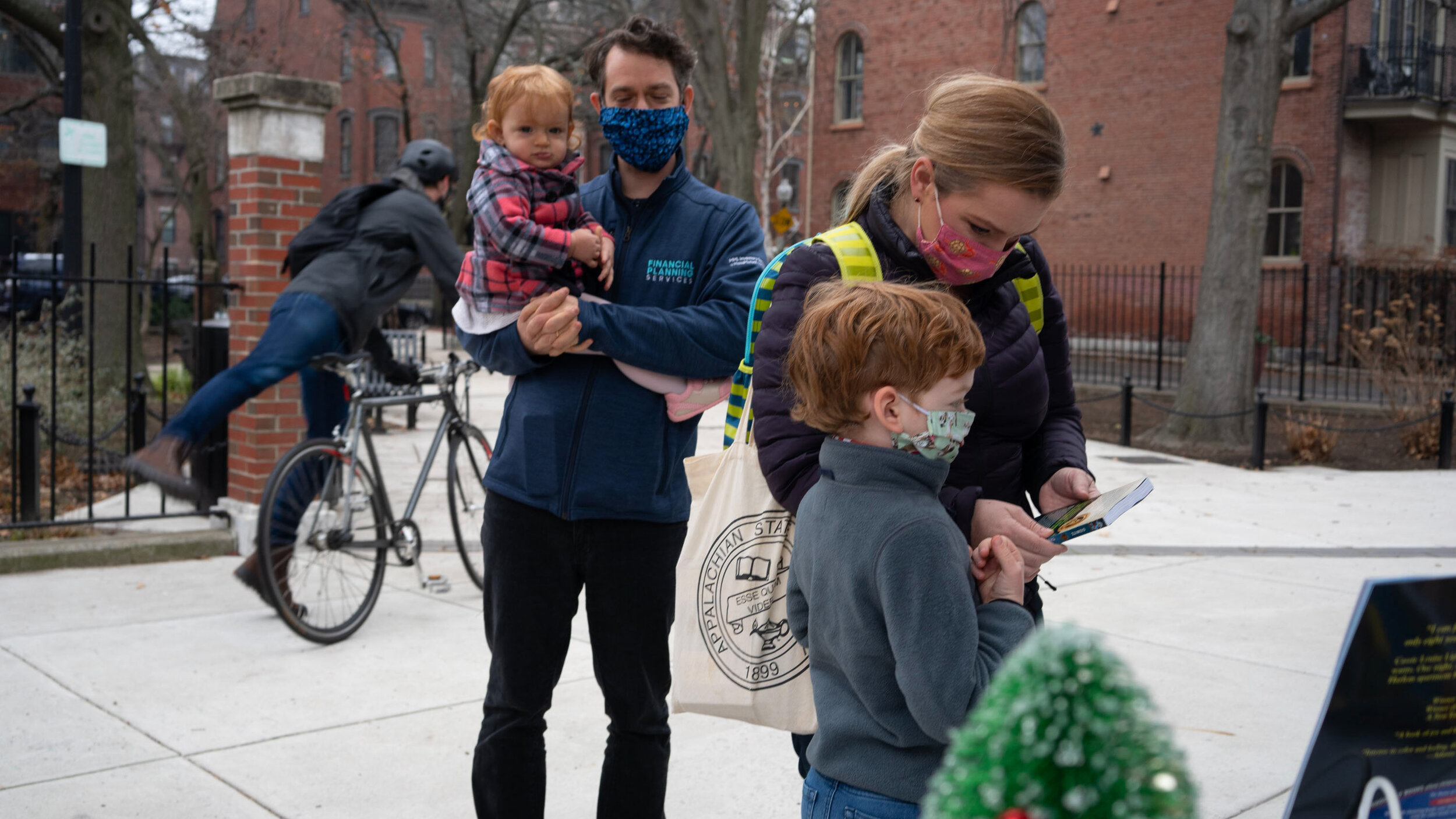 2020 has been a difficult year for all, and with limits on gatherings in place, FOSEL was unable to lighten the mood with its annual Holiday Party. Instead, we aimed to spread a little much-needed cheer by making gifts of books to neighborhood children. Despite a gray and rainy day on Saturday, December 12th, the event opened with a line of parents and their children, masked and socially distanced, waiting to be the first recipients of the Library’s gift books. Tables with new, carefully selected titles, organized according to age, were set up in Library Park and children were invited to choose their favorites to take home in brightly colored book bags emblazoned with the FOSEL logo. A handful of chocolate kisses were tossed in with each bag, adding a touch more sweetness to the treat of reading.